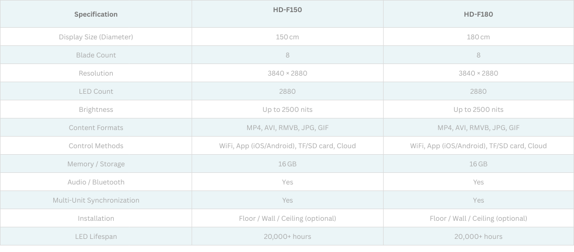 The HD-F150 features a 150 cm diameter with 2880 high-brightness LEDs and a resolution of 2048×2880, making it perfect for venues needing a bold, impressive holographic display. The HD-F180 takes large-format holograms to the next level with a 180 cm diameter, 4K UHD resolution (3840×2160 equivalent), 2500 nits brightness, and industrial-grade components for maximum durability and performance. Together, these models provide flexible solutions for any high-traffic or high-visibility environment.