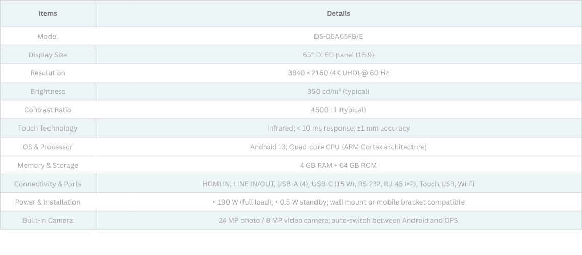 The Hikvision DS-D5A65FB/E Smart Interactive Conference Flat Panel is a 65″ 4K ultra-clear collaboration display designed for modern meeting rooms, classrooms, and business environments. It combines intelligent audio-visual performance, seamless writing experience, and advanced interactivity to enable effective communication and teamwork.