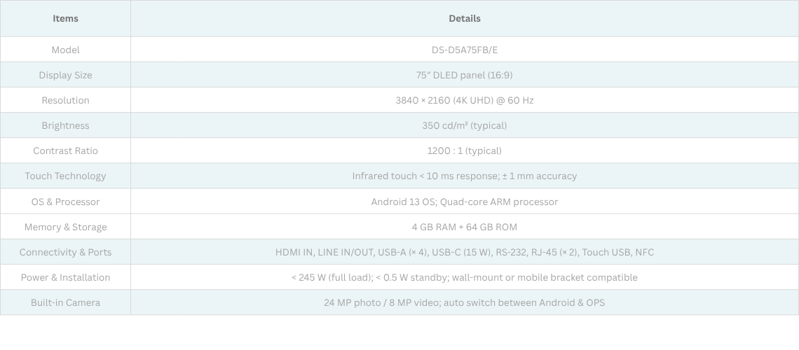 The Hikvision DS-D5A75FB/E blends precision touch performance, advanced audio-visual intelligence, and intuitive Android functionality to deliver a premium collaboration experience.
