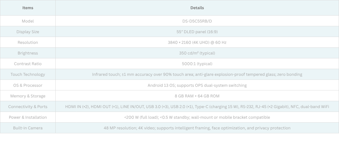 Hikvision DS-D5C55RB/D – 55″ 4K Interactive Panel (AI Camera • 8-Array Mic • Smooth Pen-on-Paper Touch)