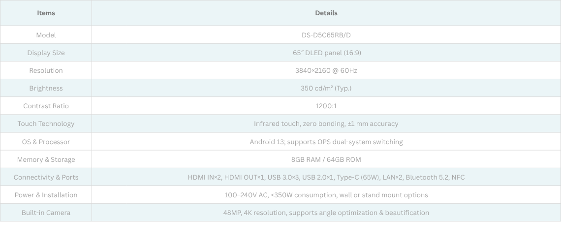 The DS-D5C65RB/D brings together cutting-edge design, intelligent sound, and visual precision — empowering professionals to present, discuss, and collaborate without barriers. Whether used in boardrooms, classrooms, or creative studios, it transforms the way teams communicate and share ideas, creating a more immersive, connected, and productive workspace.