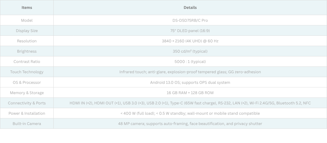 Designed for both creativity and productivity, the DS-D5D75RB/C Pro enables multi-window collaboration, precise digital writing, and easy content sharing, making it the centerpiece of modern conferencing environments.