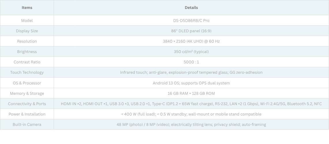 With features like wireless projection, seamless whiteboard interaction, intelligent noise reduction, and privacy-enhanced camera controls, the DS-D5D86RB/C Pro is engineered to deliver clarity, convenience, and confidence in every meeting. It’s more than a display—it’s a comprehensive communication hub that brings ideas to life, enabling real-time engagement, creativity, and connection.