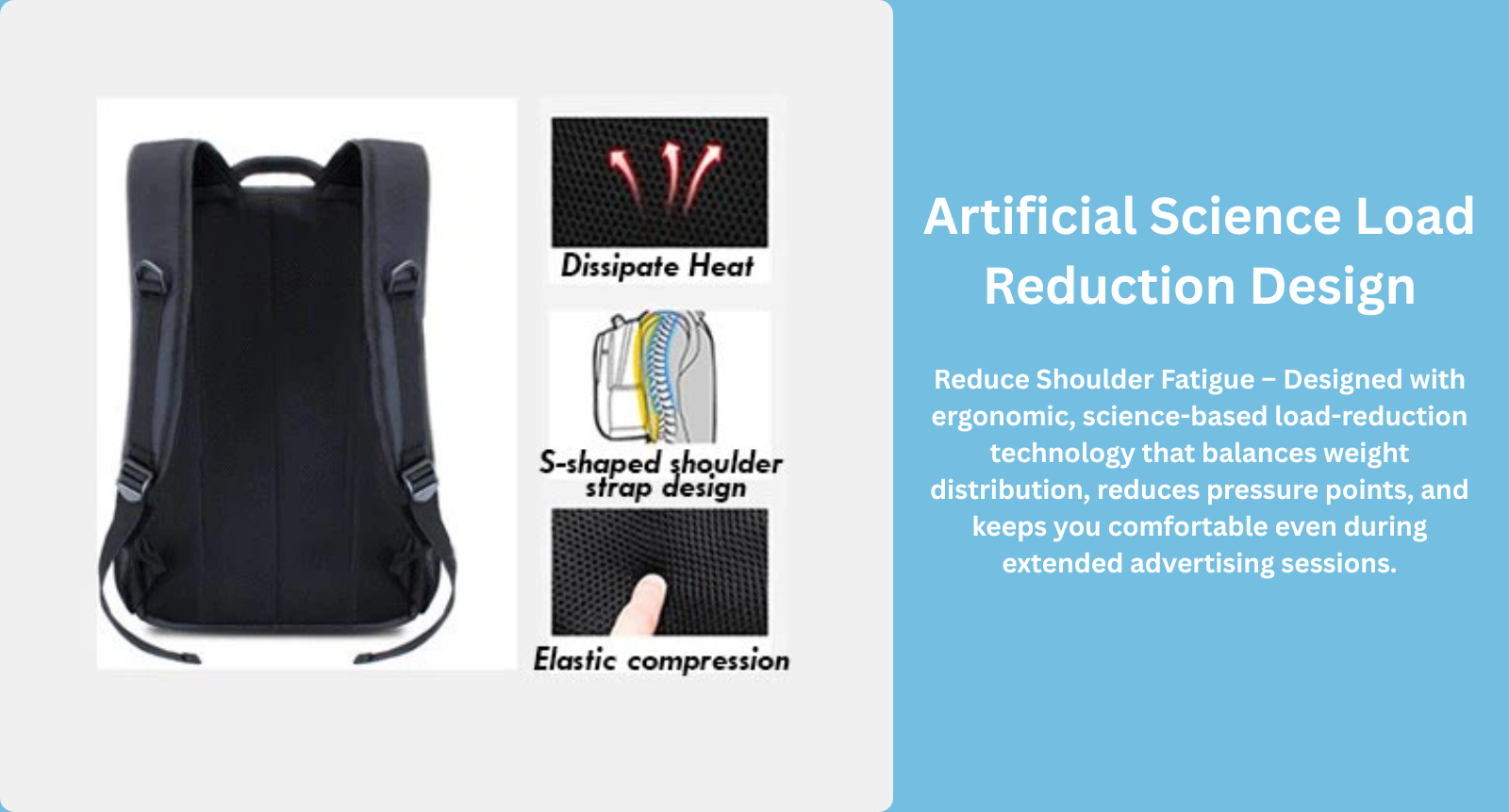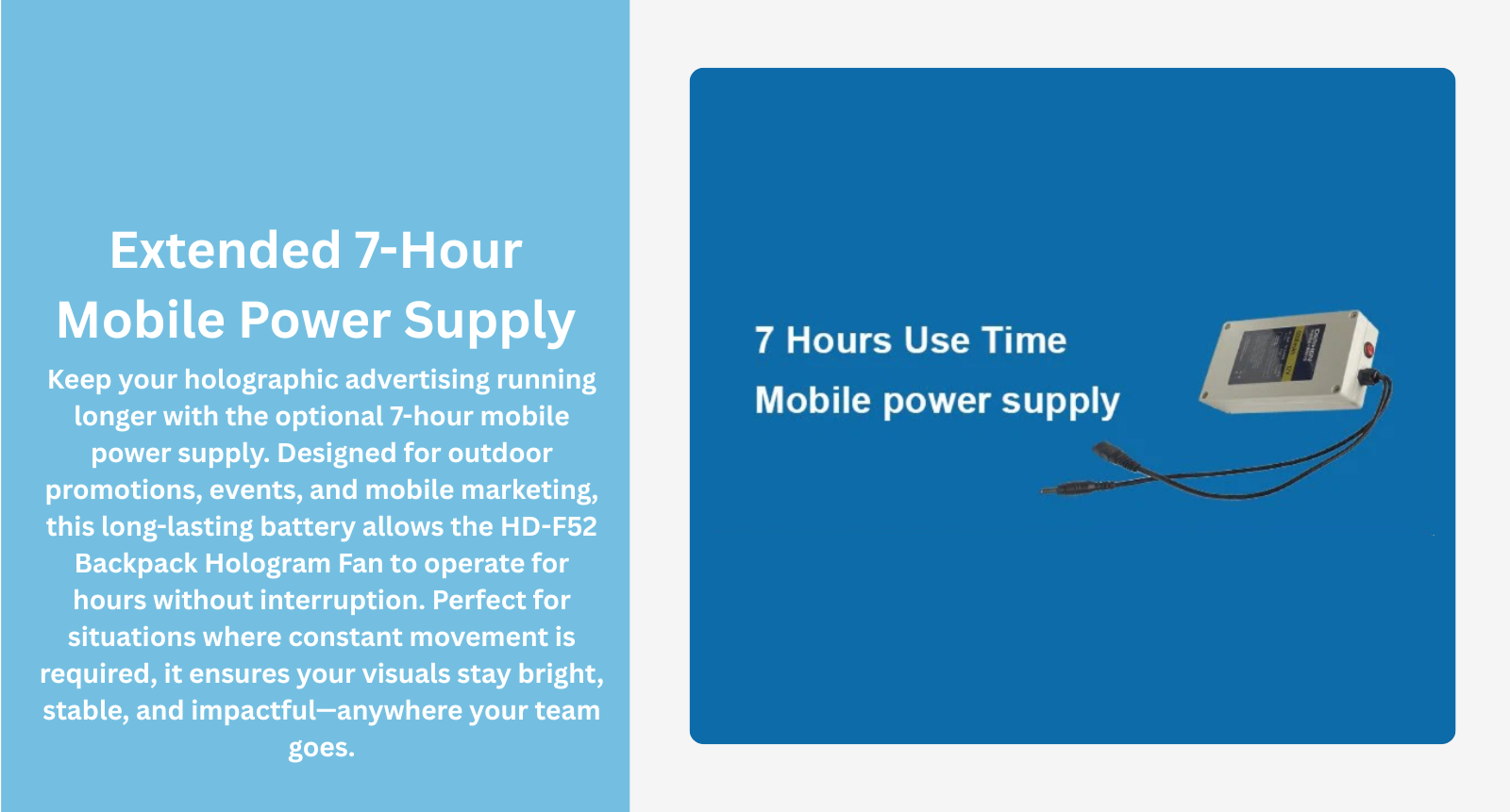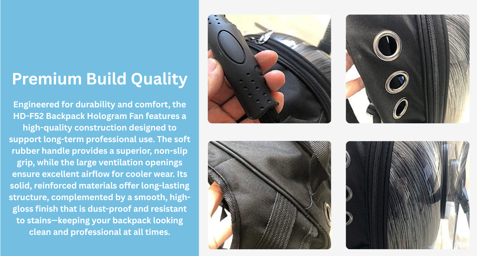 Designed for comfort and durability, the HD-F52 features S-shape shoulder straps, elastic compression padding, breathable back support, and heat-dissipation structure to minimize fatigue during long campaigns. The waterproof and dust-resistant materials ensure reliable outdoor performance, while optional built-in and extended battery options provide hours of uninterrupted holographic display.