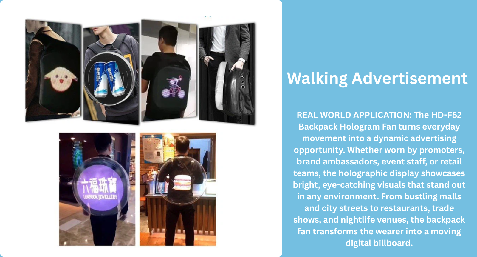 The HD-F52 Backpack Hologram Fan is a 52cm portable 3D LED display designed for mobile advertising and high-traffic promotional environments. Built into a lightweight, ergonomic backpack system, this hologram fan lets promoters walk through crowds while projecting floating 3D visuals that instantly capture attention.
