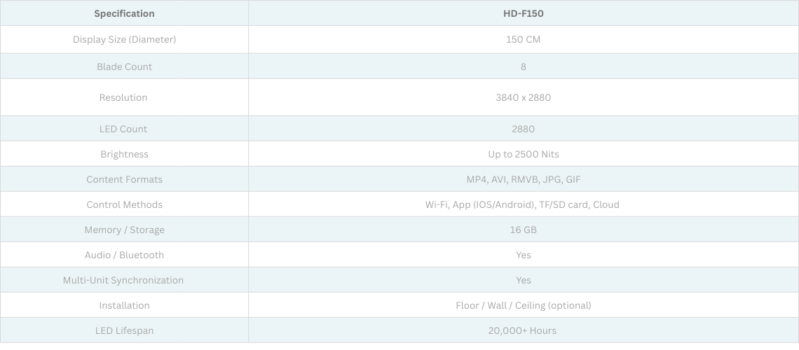 The HD Focus 3D Hologram Fan HD-F150 (8-Blades) is a large-format 150 cm LED POV holographic display that creates striking, floating 3D visuals with high clarity and impact. The system features a high-resolution output (up to 3840 × 2880), ultra-bright LEDs, and a wide viewing angle for vivid mid-air imagery visible in various lighting conditions.