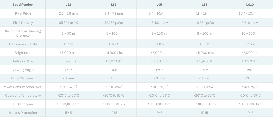With multiple pixel pitch options (LS2, LS3, LS5, LS8, LS10), this transparent LED solution supports various viewing distances and application needs. Its high transparency design maintains visibility through the screen while delivering bright, stable images suitable for both daytime and controlled lighting environments. Ideal for retail windows, exhibitions, and architectural glass installations.