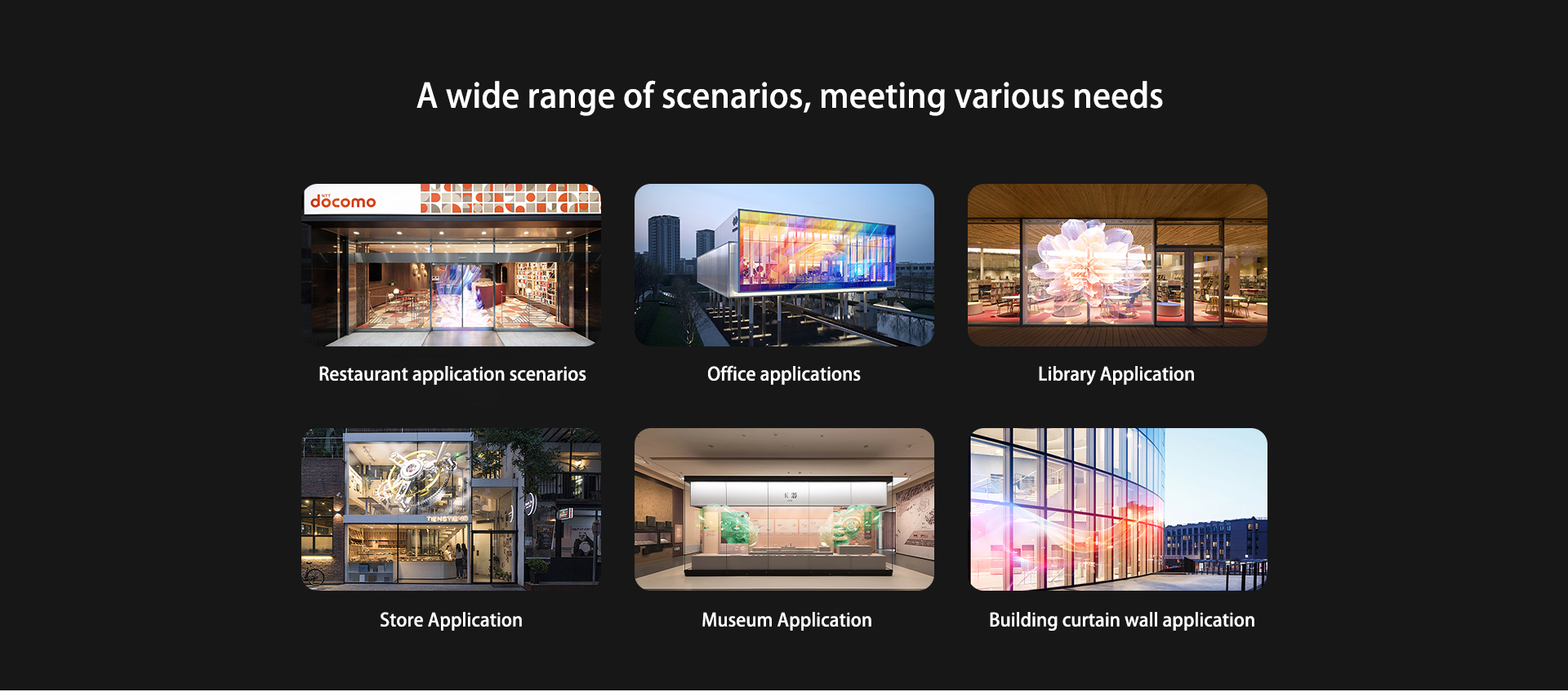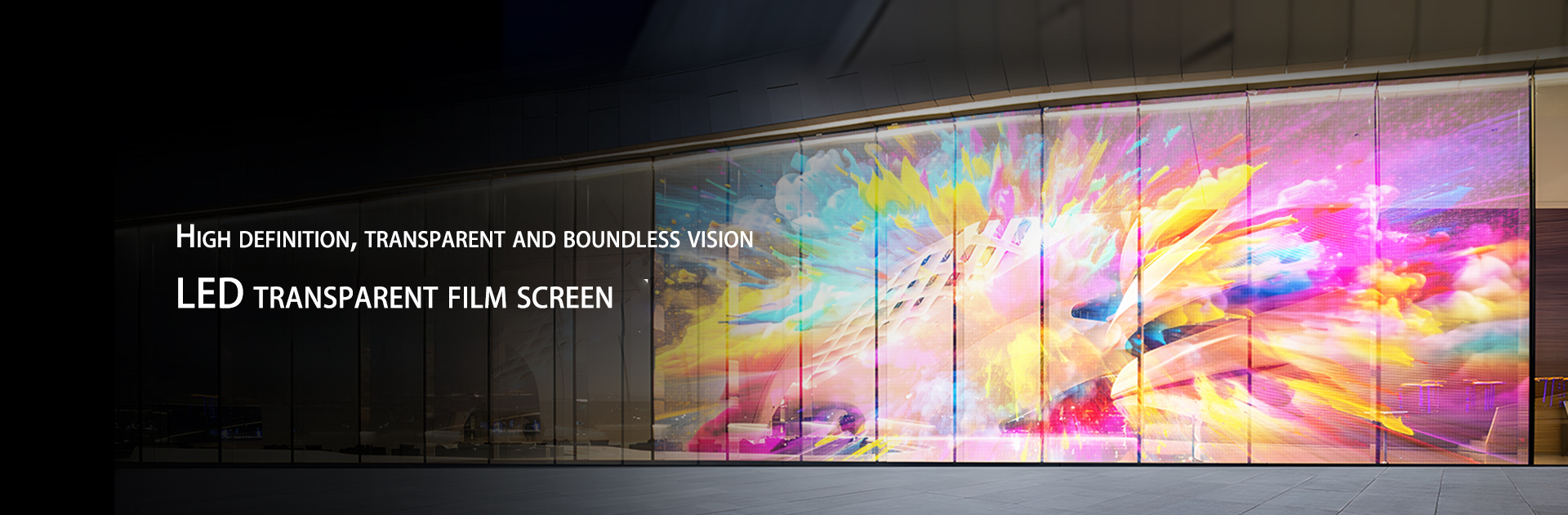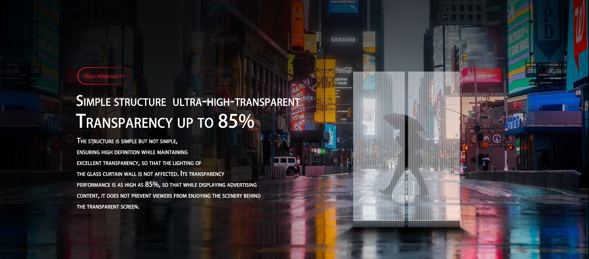 • High Transparency Design (≤50%–65%): Maintains visibility and natural light while displaying digital content