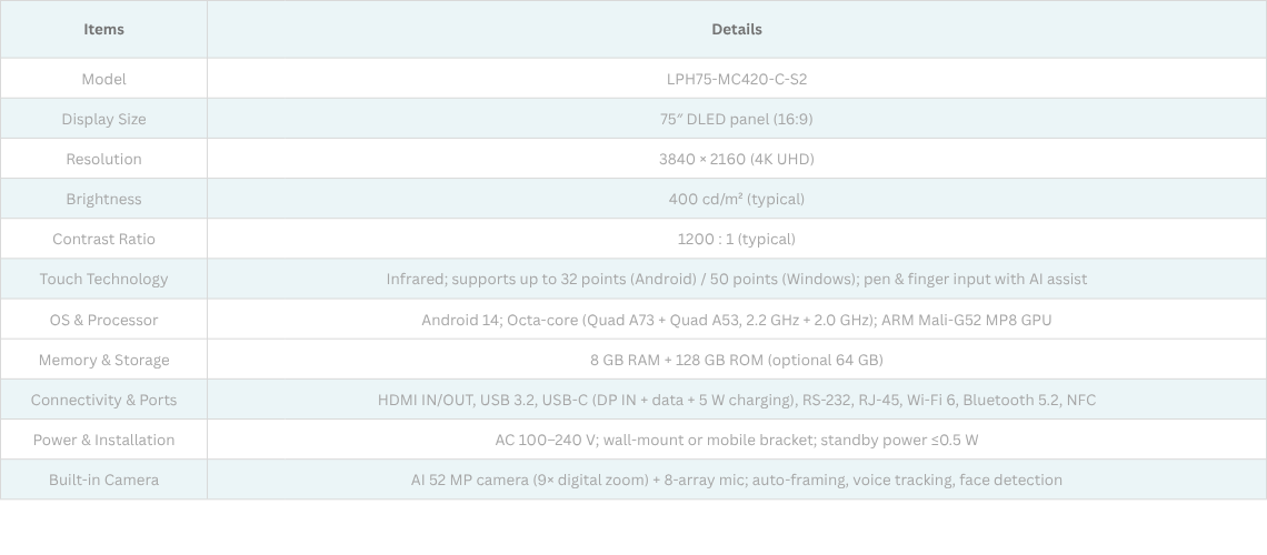 The Dahua DeepHub LPH75-MC420-C-S2 merges cutting-edge AI conferencing, advanced touch control, and enterprise-grade visuals into one collaborative platform. It’s the ultimate solution for dynamic teams that demand clarity, performance, and intelligent connectivity.