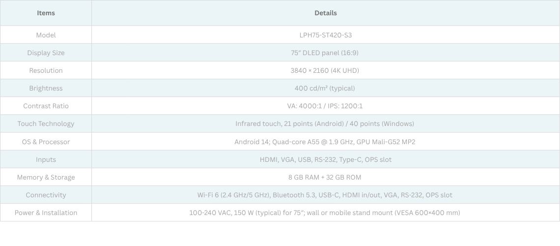 Whether you’re driving an engaging lesson, conducting a strategic board meeting or transforming a workspace into an innovation hub, the Dahua LPH75-ST420-S3 delivers smarter communication that connects ideas, people and possibilities.
