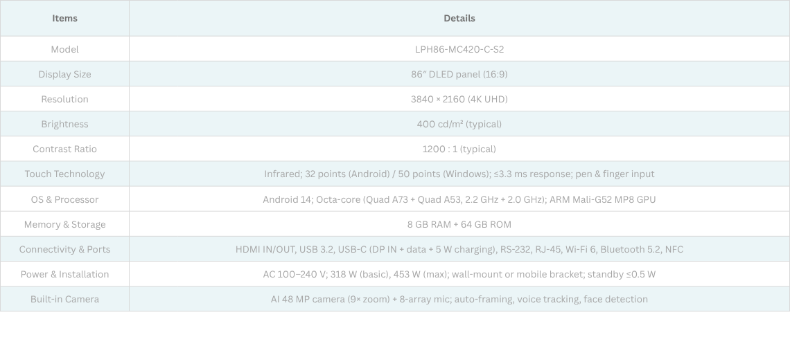 The Dahua DeepHub LPH86-MC420-C-S2 brings together AI-powered video conferencing, superior 4K visuals, and intuitive multi-touch control in one sleek all-in-one device.