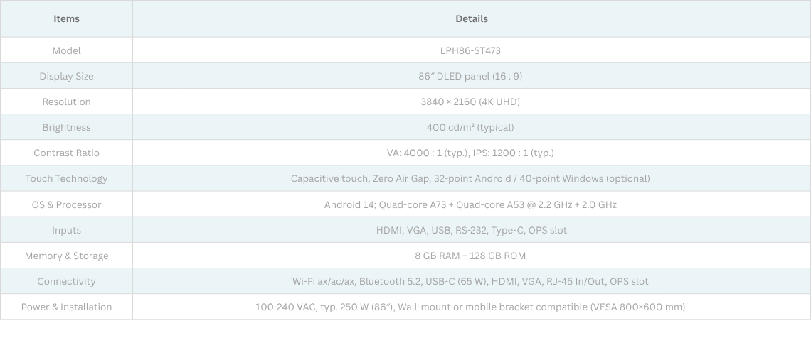 86″ 4K DLED Display with Zero-Air-Gap: Seamless visuals, reduced reflections, and robust durability.