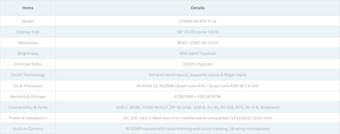 The LPH98-MC470-P-S2 redefines enterprise interactivity with its 98-inch ultra-high-definition display, AI-enhanced 52MP camera, and intelligent audio-visual performance. Designed to bridge the gap between in-room and remote participants, it ensures every voice and idea is seen, heard, and shared in true-to-life clarity—making it the centerpiece of modern business communication.