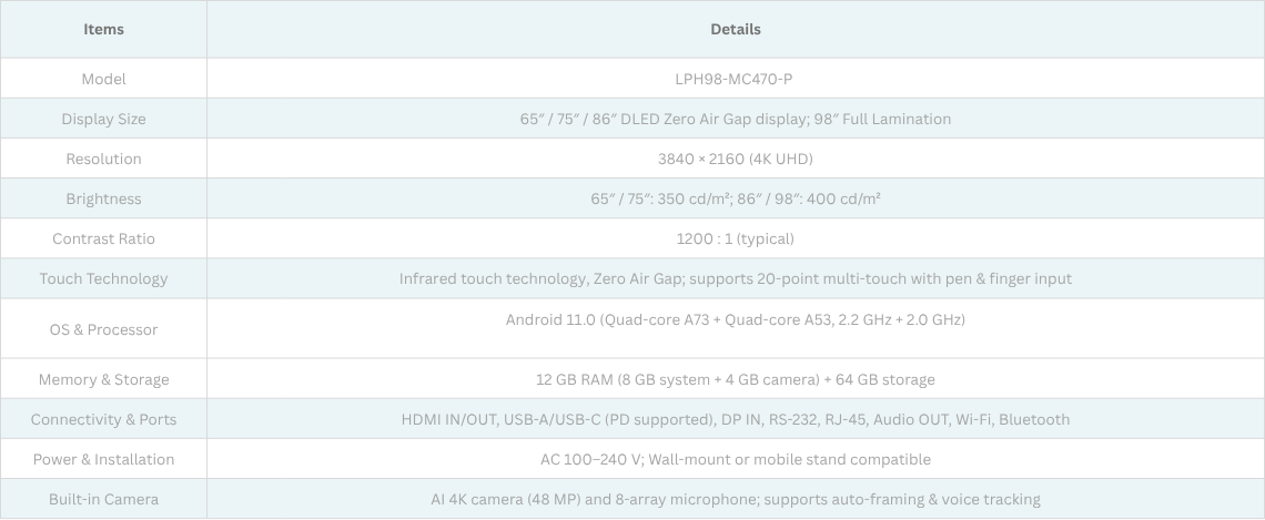 Equipped with Zero Air Gap technology (65″/75″/86″) and Full Lamination (98″), the display delivers exceptional visual clarity and color performance.