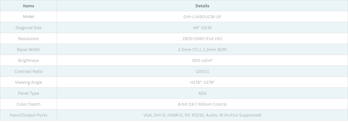 The Dahua LS490UCM-UF is a 49-inch Full HD video wall display built for continuous 24/7 operation, making it a reliable solution for demanding environments such as surveillance centers, command rooms, and commercial display setups. Its ultra-narrow 3.5mm bezel-to-bezel design enables near-seamless visuals across multiple screens.