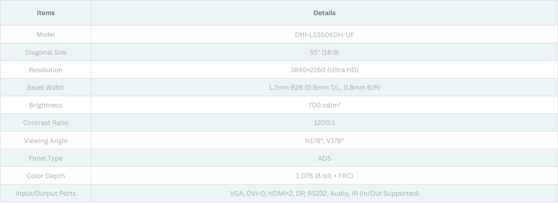 The Dahua LS550KDH-UF is a professional-grade 55-inch UHD video wall display designed for continuous operation in mission-critical environments. Featuring an ultra-narrow 1.7mm bezel-to-bezel design, it delivers virtually seamless multi-screen setups ideal for surveillance, control rooms, and commercial displays.