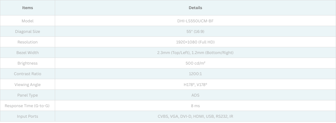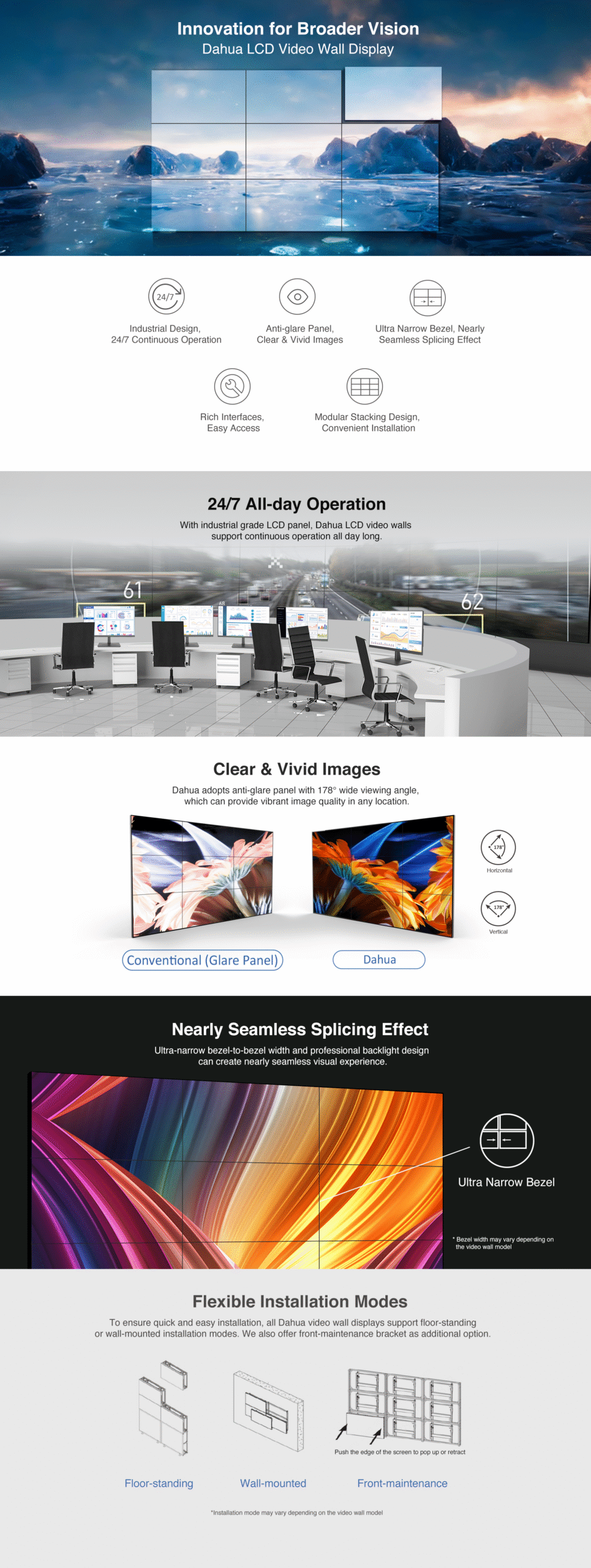 The Dahua LS550UCM-BF is a high-performance 55-inch Full HD video wall display engineered for professional visual applications. Designed with an ultra-narrow 3.5mm bezel-to-bezel layout, it delivers immersive and seamless multi-screen viewing, ideal for large-scale video wall configurations. The industrial-grade ADS LCD panel supports continuous 24/7 operation, making it ideal for control rooms, security monitoring, and commercial display environments.