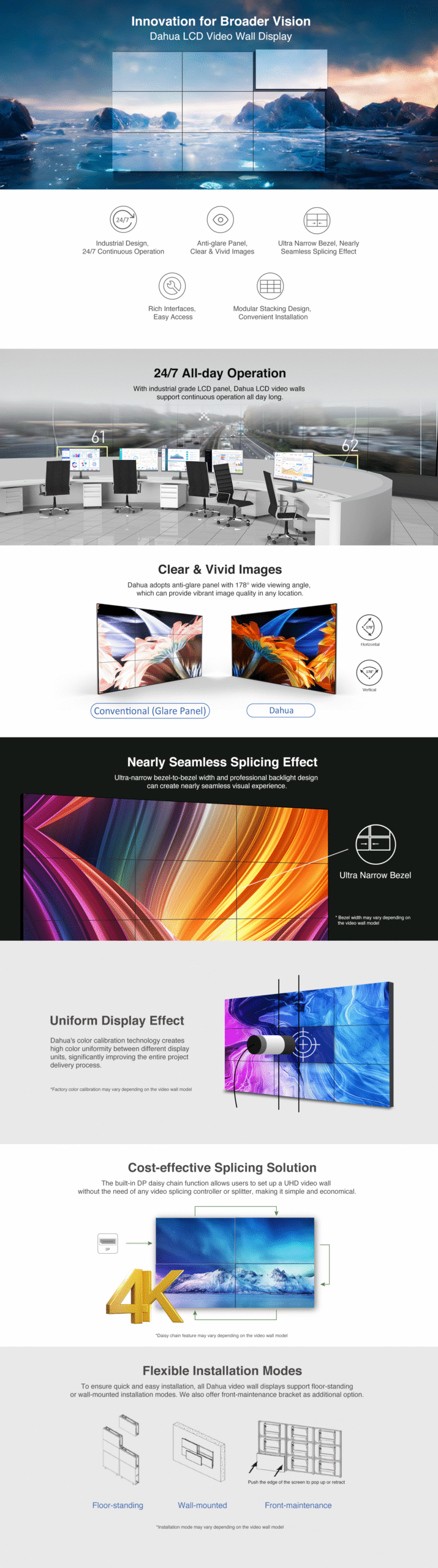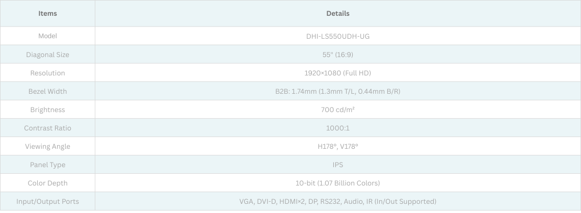 The Dahua LS550UDH-UG is a 55-inch Full HD video wall display designed for professional environments requiring reliable 24/7 operation. Featuring an ultra-narrow 1.74mm bezel-to-bezel design, this model ensures minimal visual interruption across multiple screens, making it ideal for video wall configurations in control rooms, command centers, and commercial displays.