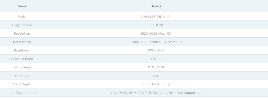 The Dahua LS550UDM-UF is a 55-inch FHD video wall display engineered for professional 24/7 operation in high-demand environments like control centers, surveillance rooms, and commercial venues. With an ultra-narrow 1.7mm bezel-to-bezel design, it enables immersive and nearly seamless multi-panel video walls.