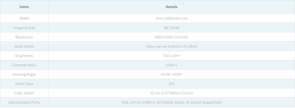 The Dahua LS550UEH-UG is a premium 55-inch FHD video wall display engineered for high-performance 24/7 operation in control rooms, surveillance centers, and commercial environments. Its ultra-narrow 0.88mm bezel-to-bezel design ensures a seamless multi-screen visual experience, ideal for large-scale video walls.