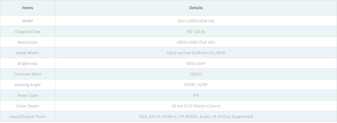 The Dahua LS550UEM-UG is a high-performance 55-inch FHD video wall display engineered for demanding 24/7 environments such as control rooms, command centers, and digital signage applications. With its ultra-narrow 0.88mm bezel-to-bezel design, it delivers virtually seamless visuals across multiple screens, ideal for impactful video wall installations.