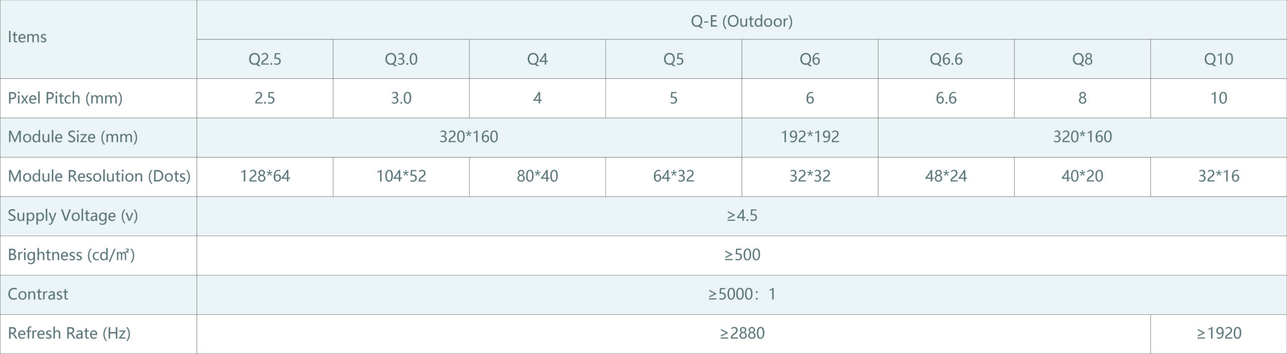 The Outdoor Q-E LED Display Series is designed for high-performance visual communication in a wide range of outdoor environments. With pixel pitches ranging from 3.0mm to 10mm, this series offers flexibility for various applications, including advertising displays in stadiums, bus and subway stations, shopping malls, retail storefronts, street signage, and landmark signage.