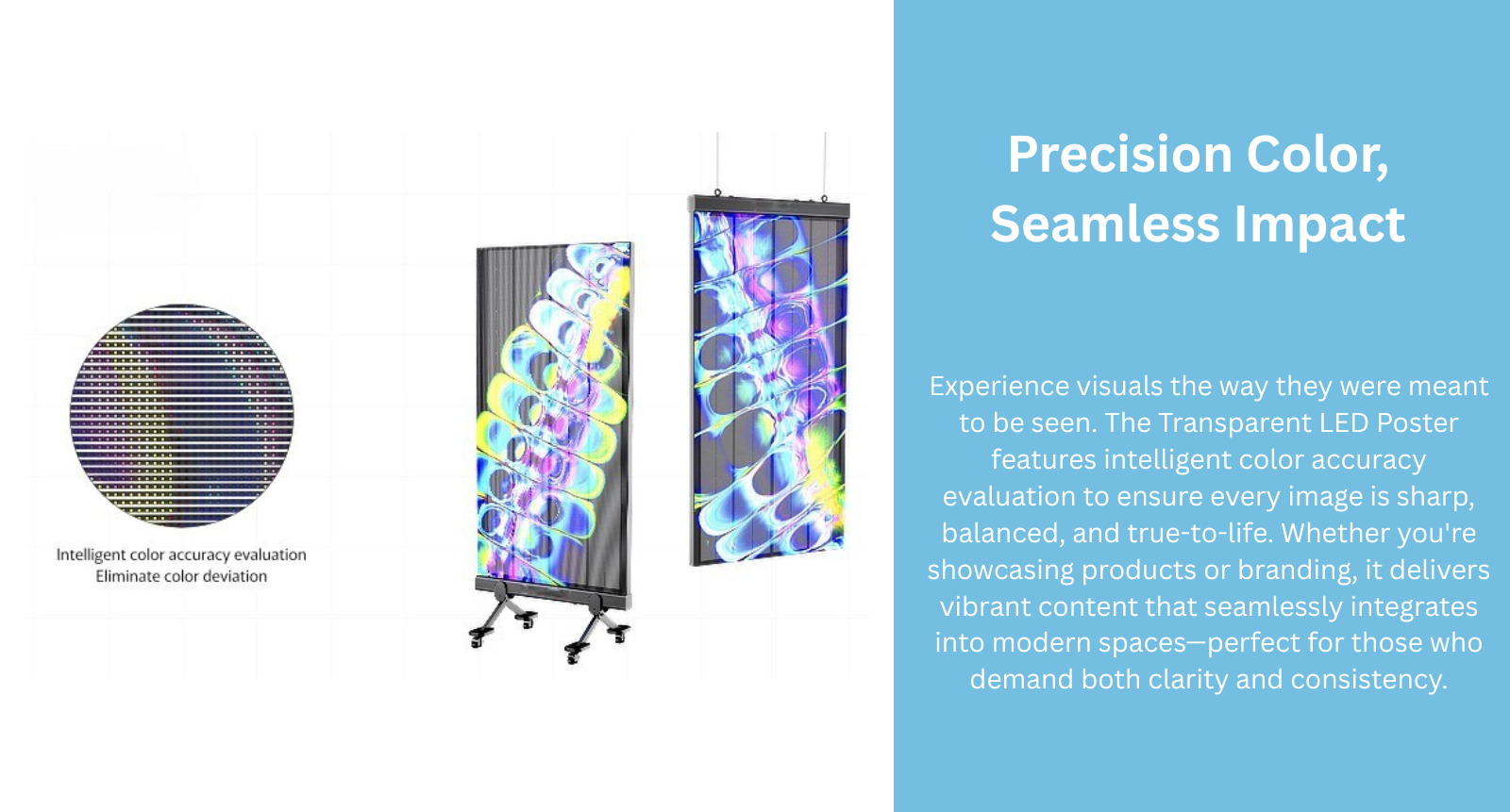 With up to 75–85% transparency, the Transparent LED Poster allows natural light and background visibility to pass through, while playing vibrant videos, animations, or branded content. Whether placed inside a retail window, at an exhibition booth, or in a modern lobby, it draws attention without blocking your space.